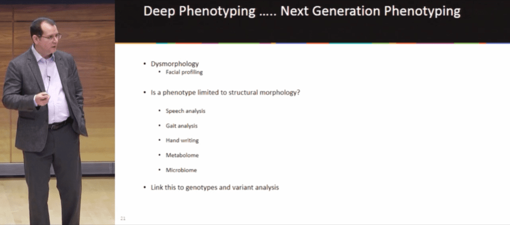 Deep phenotyping, which has existed since the 1950s, made a leap forward in dysmorphology when in 2009 NHGRI developed a common language, the hierarchical Human Phenotype Ontology (HPO). Next-generation phenotyping expands that concept, including not just structural morphology but aspects like speech analysis, gait analysis, and all of the “omics”–metabolomics, microbiomics, etc.