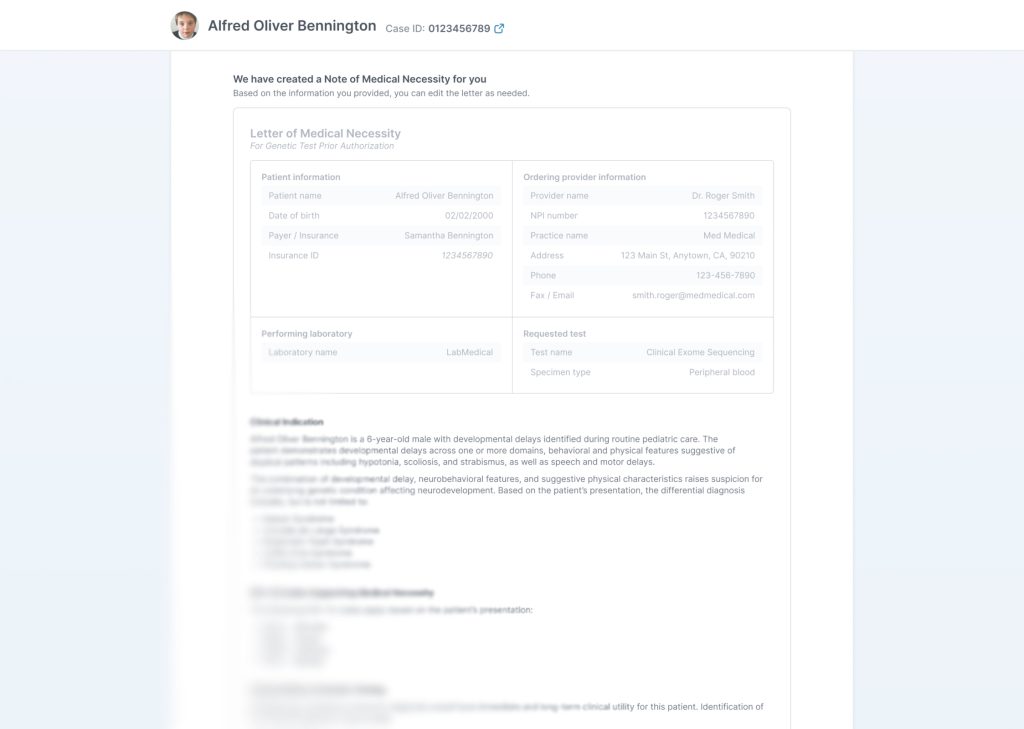 The platform auto-generates a Letter of Medical Necessity (LMN) and pre-fills lab requisition forms – the documentation that gets tests approved and ordered without back-and-forth.