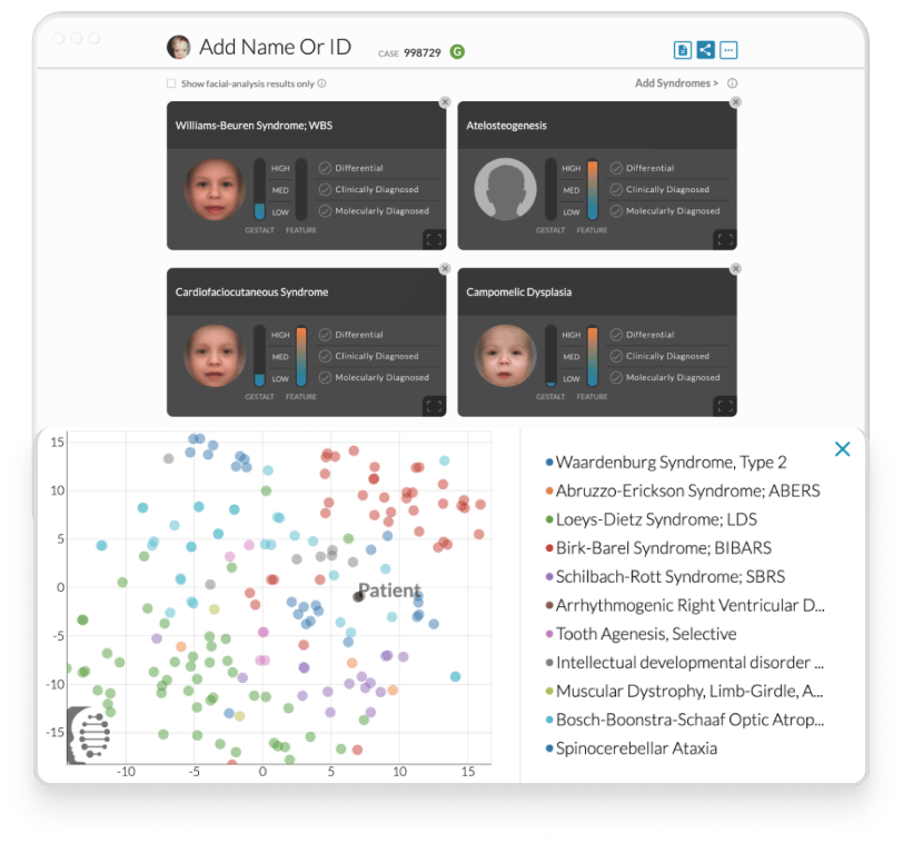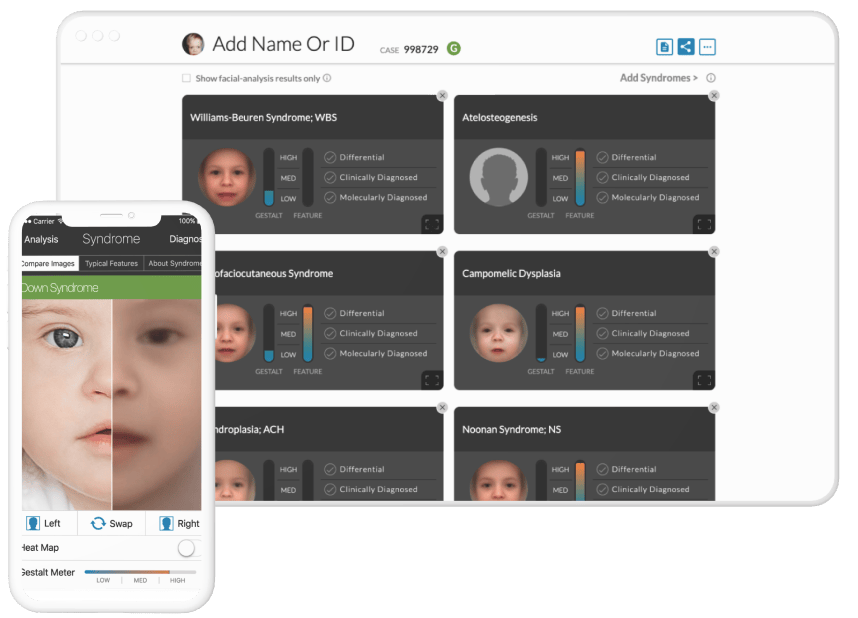 Face2Gene helps genetic professionals to detect phenotypes, reveal relevant facial and non-facial features, review relevant syndrome matches, and access best-in-class resources for faster and better analysis.
